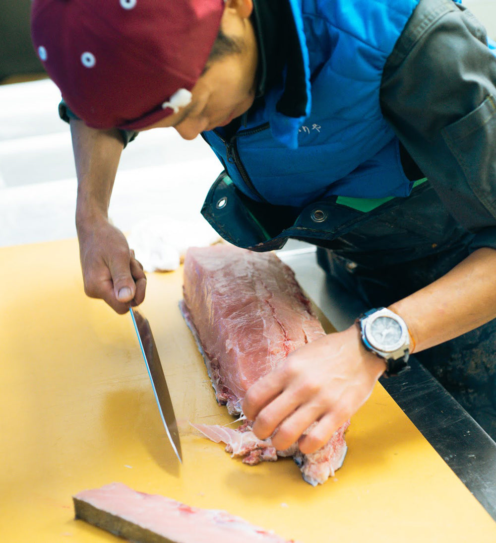 福岡の飲食店で経験を積んだのち、25歳で地元・壱岐島へ戻り飲食店を独立開業。10年経営したのち、飲食業で培った技術と経験を活かすべく仲買人へ転身。幼い頃から壱岐の魚を食べ培ったその目利き力を活かし、「選り抜いた魚を日本全国へお届けしたい。」という思いで日々魚と向き合っている。
